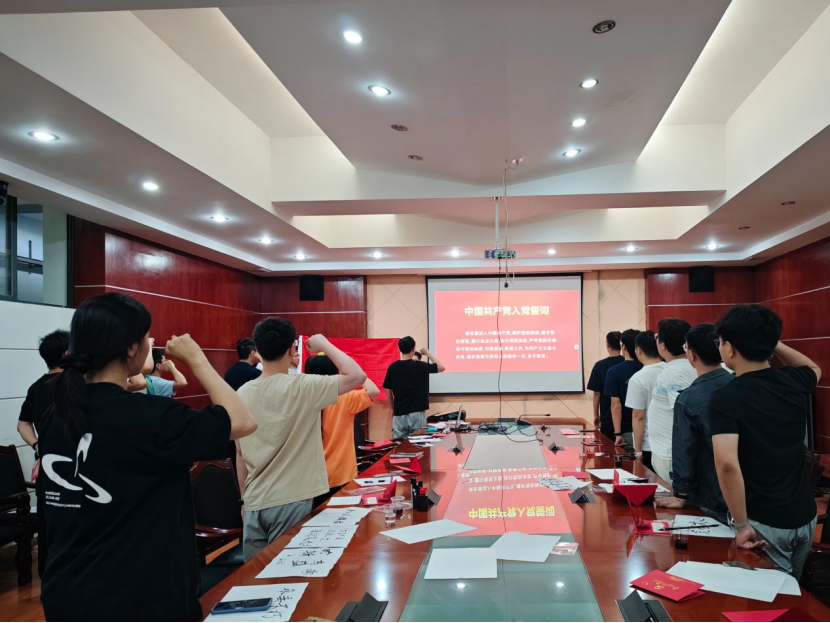 活动伊始,宣传委员施永凯同志带领全体党员庄严肃立,举起右拳,重温入党誓词。铿锵誓言回荡在会议室内,唤起每一位党员的入党初心与责任担当。支部副书记邓一平同志表示党员同志们要始终牢记誓词,将党的要求内化于心、外化于行,在今后的学习与工作中勇挑重担、甘于奉献,以坚定理想信念为青春底色,以实际行动书写无悔人生。