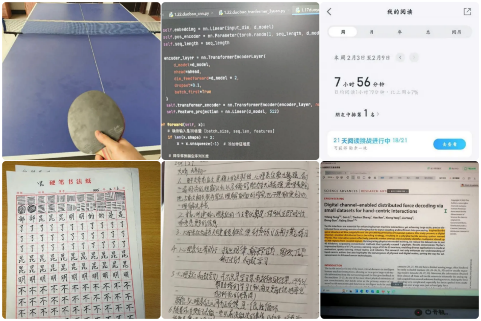 本次活动以“21天习惯养成”为核心理念,鼓励学生通过持续行动提升自我。参与者通过照片记录日常,展现了丰富多彩的假期生活:在健身板块,同学们分享跑步、跳绳、球类运动等锻炼瞬间;生活板块则充满年味,贴春联、大扫除、制作年夜饭等场景传递着新春祝福;学习板块尤为充实,阅读文献、编写代码、练习书法、背诵单词等学习画面彰显了机械院学子求知若渴的精神风貌。