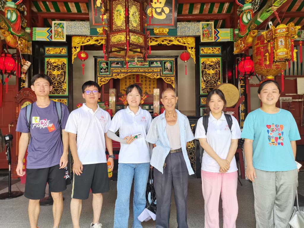 早就听林书记介绍过下湖潮剧团的辉煌历史,队员们终于在林氏宗祠内见到了这群老艺术家们。或出于身体原因,或被生活所迫,原来十几个人的乐团,如今只有六七位成员愿意不时聚集于此,弹奏陪伴他们几十载的潮乐。今天有四位老乐团成员来到现场,一位弹奏扬琴,三位拉响二胡。队员们有幸听到了五首现场演奏的传统潮乐。五曲听罢,队员们感受民乐的同时,也在林老爷爷的介绍下挥动琴竹,弹奏扬琴。