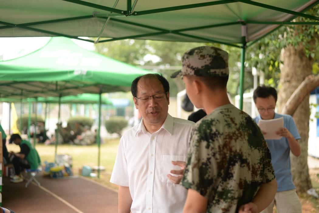 易洪波老师每天都来到大操场,和同学老师们交流谈心,认真了解军训的情况和进展。