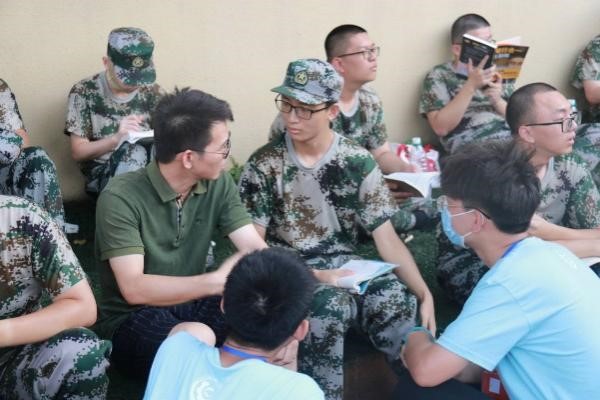 最后,学院党委书记易洪波老师在训练场一旁与两位班主任老师进行了交流。他表示,希望班主任提醒新生助理,面对新生的一切工作一定要以引导鼓励为基础展开。