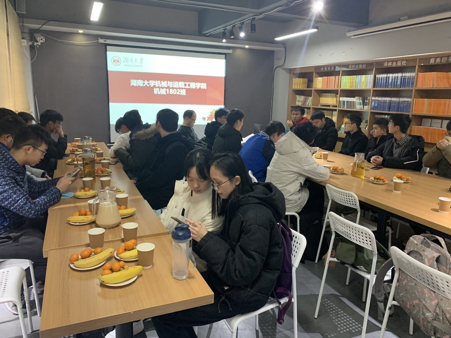 首先,任老师和同学们共进午餐,期间班长金昊同学以PPT的形式为大家讲述入校以来机械1802班一起经历的酸甜苦辣,带领同学们从“相遇的缘分”、“我们的故事”、“一起努力的身影”以及“难免的‘分别’”四个部分回忆两年半来的点点滴滴。午餐的尾声,金昊讲述了担任班长以来的心路历程以及他所观察到的同学们积极的变化,从学习、生活、工作等方面进行分析总结,最后陈述了他自己将来的打算。紧接着,每位同学就大学期间的得与失以及将来的规划做出总结分享。