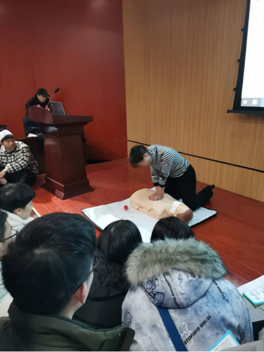 最终,老师介绍大学生医保相关事项,解答同学们的疑惑,随后对于大家普遍关心的急救难题,科普心脏骤停的原因,并对急救措施进行教学指导,利用视频和实体模型生动展现急救措施细节。