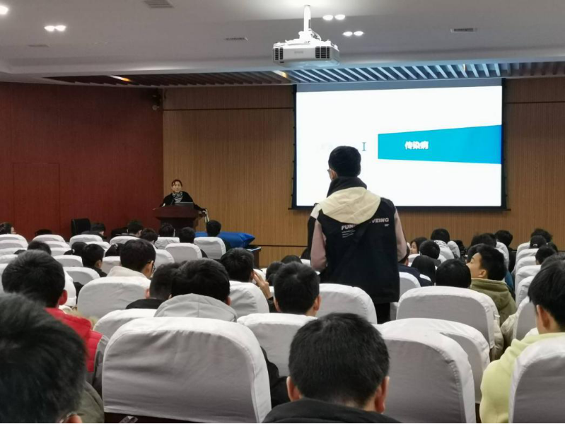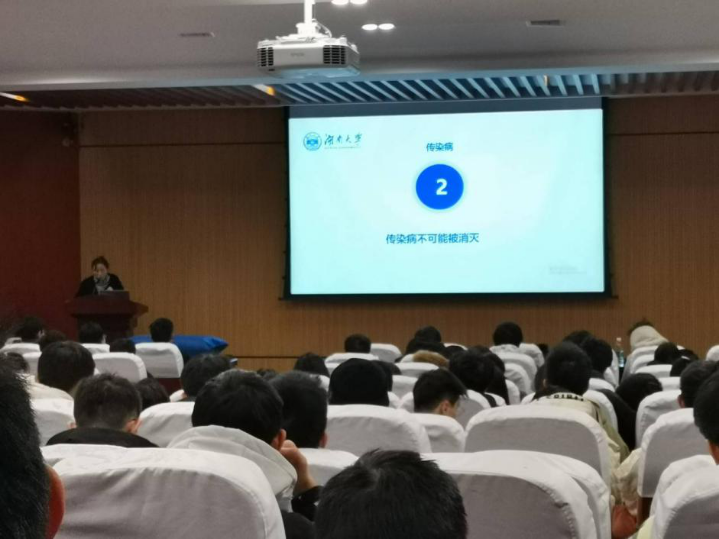 讲座开始,尹冬芳老师简单介绍今天讲座的主题,为提起学生的学习积极性,尹冬芳老师就讲解内容进行现场提问,场上同学们积极踊跃地举手回答,回答正确的同学获得小奖品,尹冬芳老师表示:许多人对于传染病缺乏正确认识,正确了解疾病、克服盲目恐惧非常必要。现场气氛轻松活跃,同学们都对接下来的讲座热情高涨。