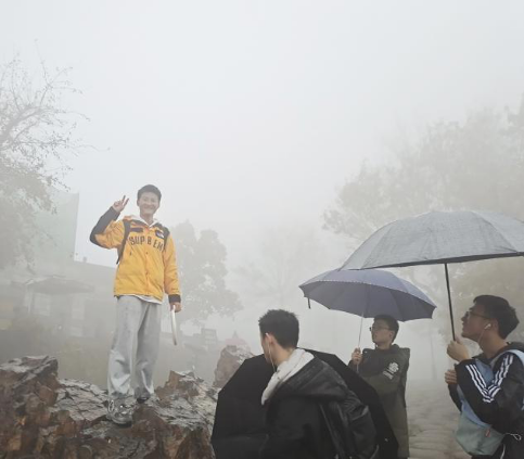 本次活动的领队是登山经验丰富的徐万青同学,精力充沛的他带着10班健儿们越过一层又一层台阶,此时的他就像探险家徐霞客,熟悉每一个路段,迈着稳健的步伐带着同学们向山顶冲击。登山路上虽有寒风细雨,但机械10班勠力前行,不畏艰难险阻,只为一览山顶的风景。风雨对于他们而言不是阻碍,只是攀登顶峰途中的一缕点缀