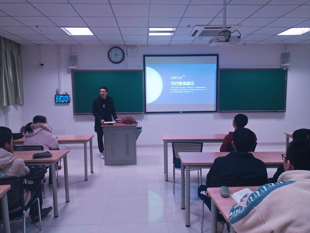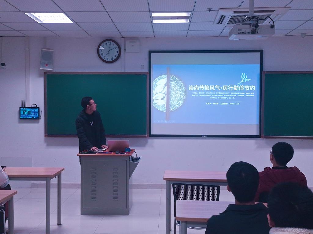 辅导员李明泽首先强调:“俭,德之共也;侈,恶之大也”,我们从小就被教育要有节约意识,为什么们都大学生了还要继续教育自己要节约粮食呢?节约是当下每个人必需的素质,营造节粮风气是时代一直久唱不衰的乐章,在为实现中华民族伟大复兴的中国梦而奋斗的青年身上更应体现出节约的作风,现在世界上仍然有很多百姓因吃不饱而受苦受累,如果我们能多节约点世界上就会少一个人挨饿。当然,我们不仅要节约粮食,也要节约用水用电用纸,绿色生活,养成一个良好的习惯就可以多为社会做出一点贡献。