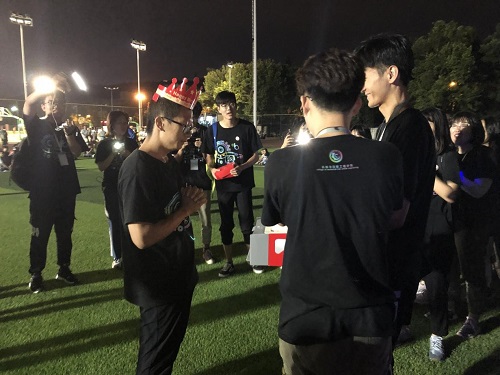 2019级新生班助们在体育馆足球场上为班级助理孙鹤轩同学庆生。