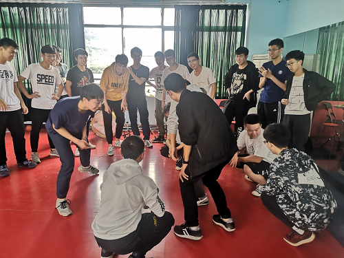 首先,团辅老师带着同学们做了开场游戏,诸如“五毛一块抱一起”,“进化论”等游戏,锻炼同学们的反应能力。“五毛一块抱一起”是把人群分为“五毛”和“一块”的两组,指令员在发出“五毛”或者“一块”的口令时,同学们要按照之前的分组迅速集中到场地上抱团。“进化论”则是所有人蹲在地上,从最低级的“蛋”做起,通过与周围人猜拳来升级或降级。胜者升级,败者清零。这个游戏一共分为四个等级,即“蛋”“小鸡”“大鸟”和“凤凰”,达成最高等级之后就可以出局了,直到最后剩下三个人游戏结束。在开场游戏里,同学们玩得津津有味,不时有欢声笑语传来。
