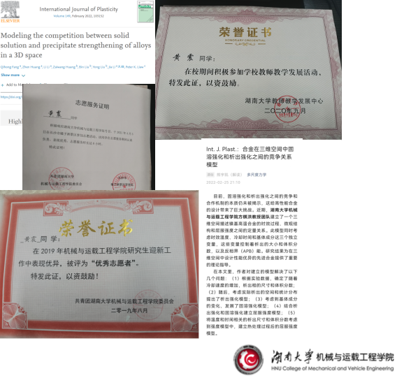 研究生期间,黄震参与了一项国家级项目“新型镍基合金成分优化与力学性能研究”和国家重点研发计划项目“高通量块体材料制备新方法、新技术与新装备”,他基于研究课题和研究内容,在塑性力学领域发表了SCI双一区期刊一篇,并被知名公众号“多尺度”力学报道。基于发表的论文,还申请了一项国家发明专利“一种镍基合金的多级析出相强度设计方法”。此外,研究生期间他还担任了本科生机械制图课程的助教,作为预备党员也多次参与了学校和学院组织的志愿者活动,例如研究生迎新志愿活动和橘子洲景区志愿活动等。在课余期间也收获了“赠人玫瑰,手有余香”的快乐。