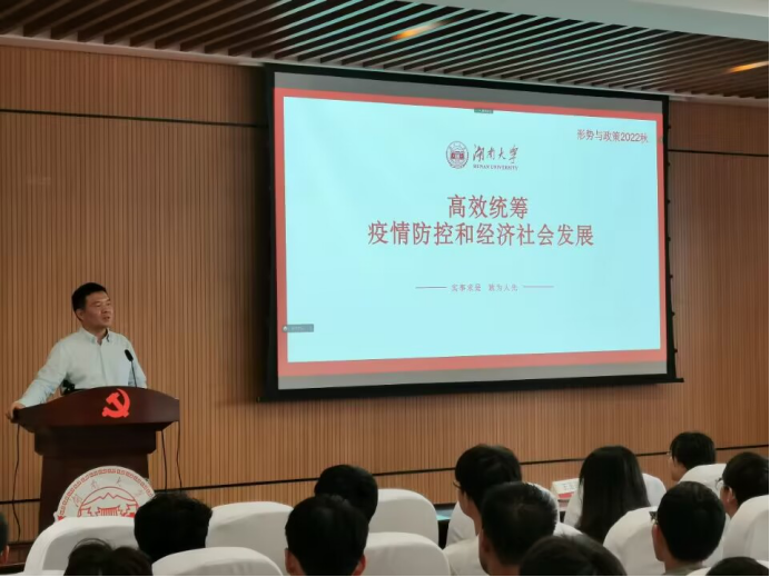 紧接着,贺书记开始题为《高校统筹疫情防控和经济社会发展》的党课,党课中贺书记带着大家回顾疫情爆发以来的各种事件,为大家介绍了我国疫情防控的基本政策以及我国疫情防控情况,通过国内国外的对比让大家再次深刻的认识到疫情防控措施的重要性。随后,贺书记带着大家分析了我国GDP、粮食产量、工业规模、社会零售额、全国固定资产投资、进出口总额等数据,让大家直观的看到我国经济的迅速发展。