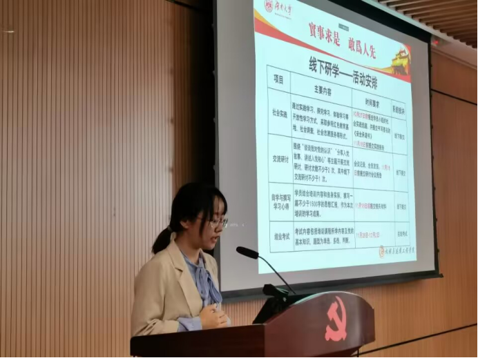 随后,由王玉迪老师为大家讲解本次培训班的培训内容和纪律。培训内容包括四次线下授课以及一次社会实践,且要求学生进行自主交流研讨、撰写学习心得,并完成最终的结业考试。同时,鼓励各小组在院级即以上党务工作网站发表学习心得或实践活动新闻稿,对此次培训、实践开展有效宣传。