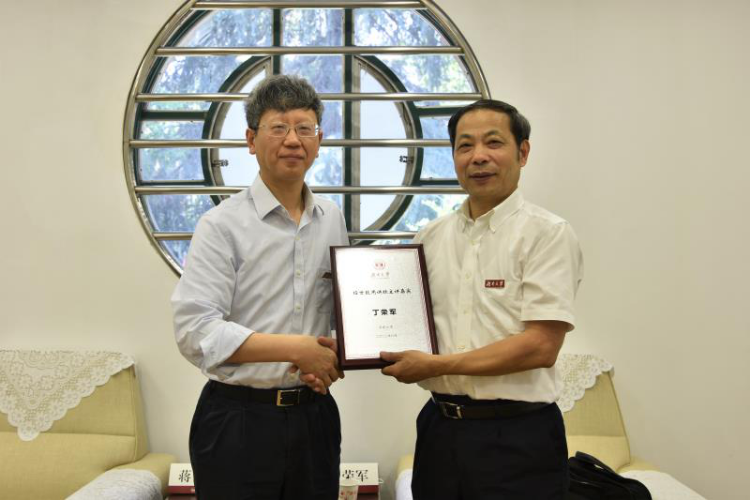 蒋健晖(左)为丁荣军院士(右)颁发铭牌