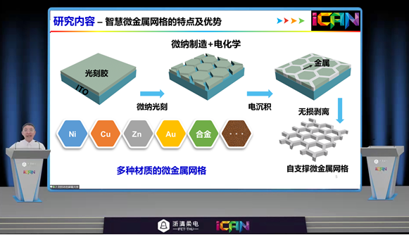该获奖课题创新性地提出“多功能金属微网格柔性电极”的新思路,通过将微纳光刻和高精度电镀技术相结合制备了系列材质、形状、尺寸、透光率和厚度可精准控制的柔性超薄超轻金属网格,并将其成功应用在柔性电池和柔性电致变色器件中(相关工作请见;//onlinelibrary.wiley.com/doi/10.1002/eem2.12303),为柔性电极的轻量化设计和柔性电子的多功能集成提供了一种新的方法和思路。
