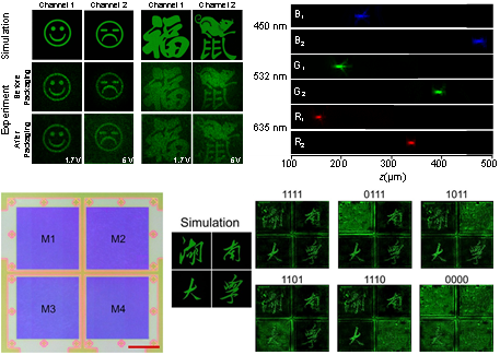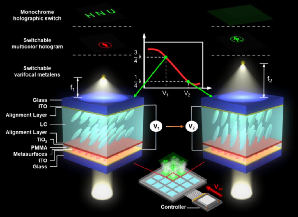 因此,该集成方案不仅简化了器件加工工艺,还有效提高了器件性能。基于此,研究团队演示了电控可调谐单色和多色可切换超构表面全息以及动态变焦超透镜。研究团队还将进一步将该方案应用于透射式可寻址调谐超构表面器件。由于超构表面具有前所未有的像素化偏振控制能力,如果结合液晶的偏振控制能力,有望实现动态可调的偏振转换、偏振相关的多路复用以及复杂的矢量光束。液晶不仅对电激励响应,也可以对热、力、光和磁场做出响应,这极大扩展了动态超构表面在不同场景的应用可能性。另外,通过更精细的电极加工可以实现更多像素的可寻址调控,有望在空间光调制器、激光雷达和全息显示等关键基础元器件中得到应用。