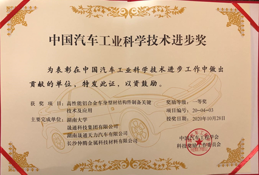李落星教授领衔的项目“高性能铝合金车身型材结构件制备关键技术及应用”,获得中国汽车工业科学技术进步一等奖。