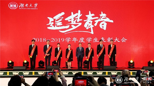 12月17日晚,2018-2019学年度学生表彰大会在大礼堂举行。校长段献忠发表讲话,并为先进个人和先进集体代表颁奖、佩戴“湖大以你为荣”绶带。“倪正东奖学金”设奖者、 85po