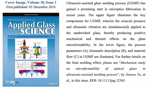 国家高效磨削工程技术研究中心余剑武教授在2018年12月3日出版的《应用玻璃科学》(Applied Glass Science)上发表最新研究成果“Mechanism Study on Micro-formability of Optical Glass in Ultrasonic-assisted Molding Process”,并选为该期刊的封面。《应用玻璃科学》是在玻璃领域最具权威性的综合性学术期刊之一,主要发表玻璃材料学前沿领域重要的原创性研究成果。该成果以 85po