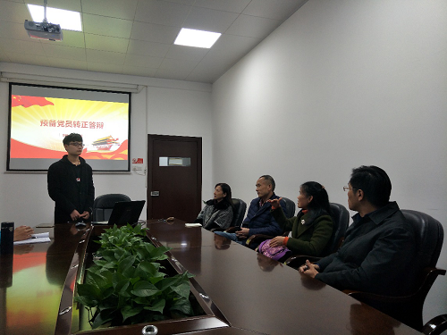 在各位党员充分交流讨论后,易洪波书记宣布答辩正式开始。支部预备党员杨士超同志从思想、学习、工作、生活四个方面对自己进行了分析和总结。答辩完毕后,支部党员积极提问考察。支部书记易洪波同志问到:“你学习过哪些党的理论?是否通读过新修订的《中国共产党纪律处分条例》?”并表达了对杨士超同志的期望,也对所有支部党员提出了要求。支部党员充分了解杨士超同志后,对是否同意其按期转正进行了表决。