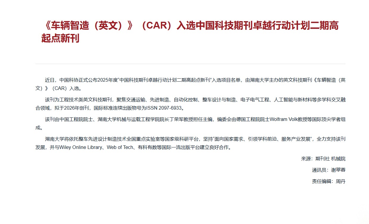 近日,中国科协正式公布2025年度“中国科技期刊卓越行动计划二期高起点新刊”入选项目名单,由湖南大学主办的英文科技期刊《车辆智造(英文)》(CAR)入选。该刊为工程技术类英文科技期刊,聚焦交通运输、先进制造、自动化控制、整车设计与制造、电子电气工程、人工智能与新材料等多学科交叉融合领域,拟于2026年创刊,国际标准连续出版物号为ISSN 2097-6933。该刊由中国工程院院士、湖南大学机械与运载工程学院院长丁荣军教授...